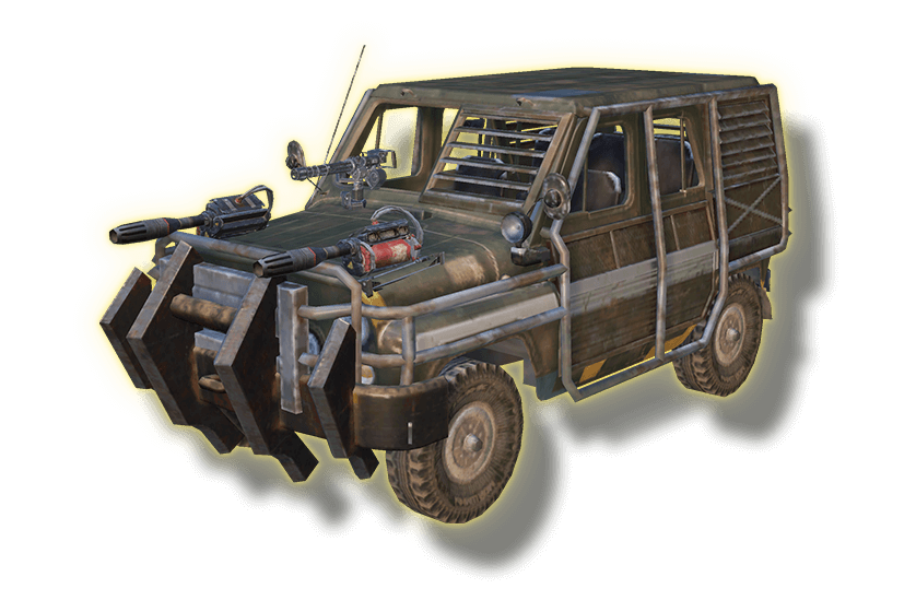 Der UAZ ist ein bewaffneter Geländewagen mit vier Sitzen.Er ist ausgestattet mit einem Flammenwerfer, einer Gatling-Kanone und einem Raketenwerfer.
